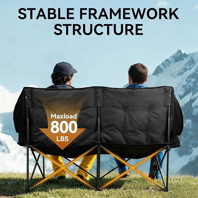 Double Camping Chair Padded Camping Chairs Heavy Duty 2 Person Camping Chair Oversized Loveseat Camping Chair with Cup Holders Camping Couch Support 800LBS,Black