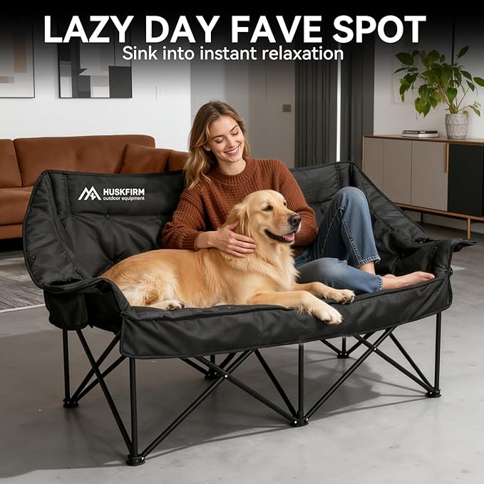 - Heavy Duty double folding chair;Huskfirm oversized camping chair built with a reinforced steel frame + 600D Oxford, sized 60” x 23.6” x 34.8” and supports up to 800 lbs. A true double outdoor chair that upgrades your camping essentials and camping gear setup.